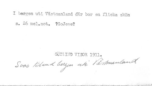 //// I bergen uti Västmanland där bor en flicka skön //// s. 26 mel.not. ?GoJeve? //// G^TLIND VISOR 1911. ////
