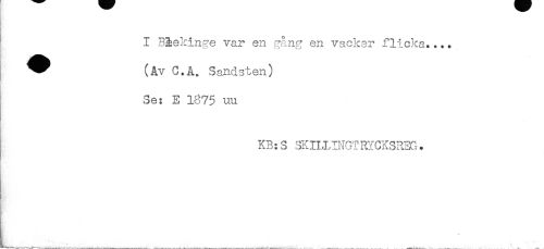 //// - //// I Blekinge var en gång en vacker flicka.... //// ------* —V //// H //// ^^ (åv C.A. Sandsten) //// Se: E 1875 uu //// KB: S 3KIHINGIRYCKSREG. ////