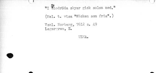 //// "I ^lodroda skyar gick solen ned.^ //// (Mel. t. visa "Näcken som fria'*.) //// Vsml. Norberg, 7612 s. 49 //// Lagergren, E. //// UU1Å. ////