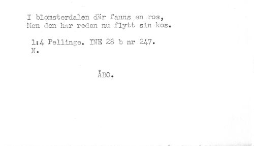 //// I blomsterdalen där fanns en ros, //// Men den har redan nu flytt stn kos. //// 1:4 Pellinro. INE 28 b nr 2/,7. //// N. //// ÅBO. ////