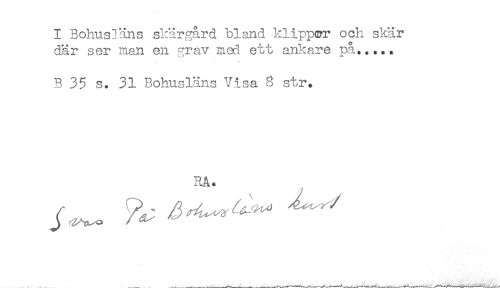 //// 1 Bohusläns skärgård bland klipp&r och skär //// där ser man en grav med. ett ankare på..... //// B 35 s. 31 Bohusläns Visa 8 str. //// RA* //// __- . _______—------ ////