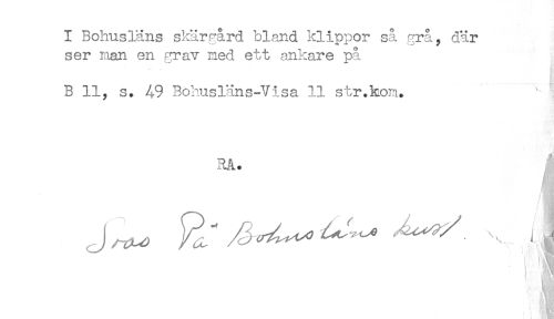 //// I Bohusläns skärgård bland klippor så grå, där //// ser nan en grav med ett ankare på //// B 11, s. 49 Bohusläns-Visa 11 str.kom. //// 3A. //// i ////