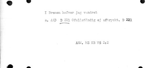 //// I Bremen hafver jag vandrat //// s. AG3 D 221 Ofullständig ej aftryckt. D 231 //// AHH. MS KB VS 2:2 ////