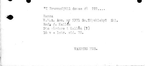 //// "I Brummefjäll doi/as då ???____ //// - ^^ V.H.Ä. Acc. y 5371 3n.?Myckleby? gki. //// i Rof^ J. Kall^i //// Din pardare i Kallån (?) //// 16 v - latr. sid. 78. //// VARBERG HUS. ////