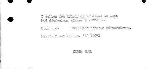 //// ^^ I cellen den dödsdömde Nordlund nu satt //// ^^ Med djefvulens planer i sinne.... //// Utan prov Nordlunds senaste mördarebragd.. //// * //// s //// Hskpt. Visor VIII s. 319 32972 //// ! //// 1 //// NORD: MUS. ////