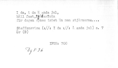 //// I da, i da ä a.nda. jul, //// håll fast,?M%an?xiin //// för dagen simes intet än men stjärnorna.... //// . //// Staffansvisa (://: I da ://: å anda jul) s. 7 //// dr (D) //// IFGH: 700 //// / ^ ////