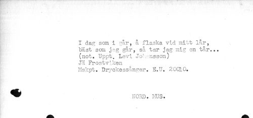 //// I dag som i går, å flaska vid mitt lår, //// bäst som jag går, så tar jag mig en tår... //// (not. Uppt. Levi Johansson) //// Jä Frostviken //// Mskpt. Dryckessånger. E.U. 2GQL0. //// ^ NORD. HUS. ////