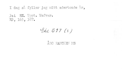 //// I dag så fyller jag mitt adertonde år, //// 3:4 RE. Uppt. Wefvar. //// R3, 165, 387. //// ^ //// ÅBO RAI'ICKE-1 US ////