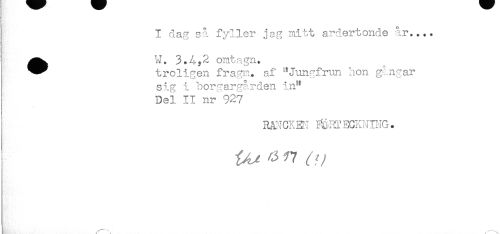 //// j I dag så fyller jag Blitt ardertonde år.... //// } ^^ H. 3.4,2 omtagn. //// I ^^ troligen fragm.. af '^Jungfrnn hon gångar //// sig i borgargården in^ //// j Del II nr 927 //// I RANCKEK %RT ECKWING. //// / \ ////