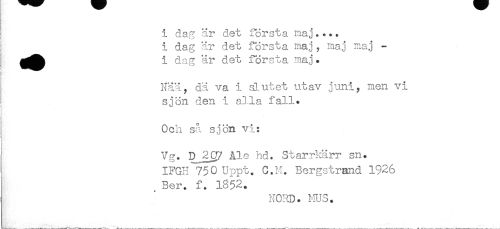 //// i dag är det första maj.... //// i dag är det första maj, maj maj - //// ] i dag är det första, maj. //// * //// Nää, dä va i äLutet utav juni, men vi //// ! sjön den i alla fall. //// Och så. sjön vi: //// i //// V.?. D 207 Åle hd. Starrkärr sn. //// IFGH 750 Uppt. C.M. Bergstrand 1926 //// Ber. f. 1852. //// NORD. MUS. ////