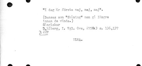 //// "I dag är första maj, maj? maj^'. //// (Dansas som "Skåning" men gå längre //// innan de vända.) //// Sånglekar //// Dahlberg, 1. Vgl. Ova, 2750:3 s. 136,137 //// ^207 //// uniA. //// y ////