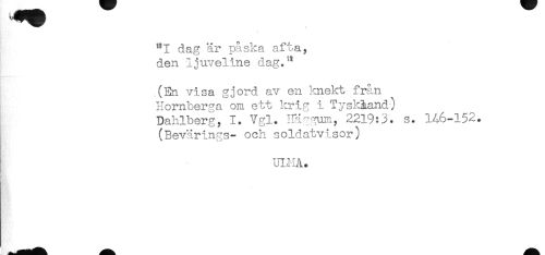 //// "I dag är påska af ta, //// den ljuveline dag. //// (En visa gjord av en knekt från //// Homber<?a om ett krig i Tyskland) //// Dahlberg, 1. Vgl. Häggum, 2219:3. s. 146-152. //// (Bevärings- och soldatvisor) //// UIJIA. //// g,*, ////