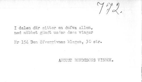 //// t //// * //// I dalen där sitter en dufva allén, //// ned näbbet gomdt under dess vingar //// Nr 154 Den cfvergivnas klagan, 30 str. ^ //// i //// AUGUST BONDESONS VISBOK. //// - //// i //// t ////
