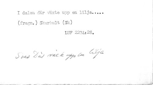 //// I dalen där växte upp en lilja..... //// (fragm.) Skarhult (Sk) //// LUF 2274:28. //// } //// r //// j ////