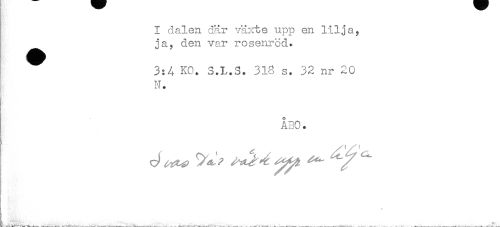 //// I dalen där växte upp en lilja, //// ja, den var rosenröd. //// 3:4 KO. S.L.S. 318 s. 32 nr 20 //// I N. //// ÅBO. //// . ....... ////