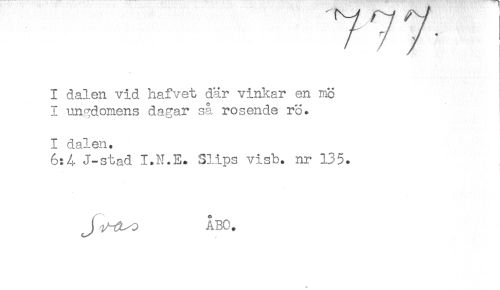 //// 7 / /' //// I dalen vid hafvet där vinkar en mö //// I ungdomens da^ar så rosende rö. //// 1 dalen. //// 6:4 J-stad I.N.E. Slips visb. nr 135. //// J ABO. ////