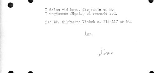//// I dalen vid havet där växte en mö //// I ungdomens fägring så rosende röd. //// 5:4 LT* Silfvasts Visbok s. 116-117 nr 60. //// ABC. //// I ////