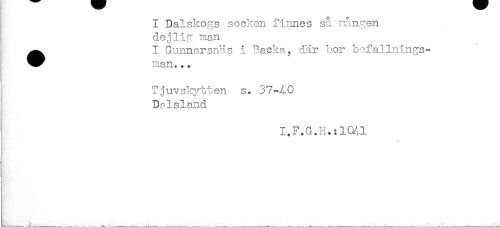 //// I Dalskogs socken finnes så mången //// dejlig man //// i; ^^ I Gunnarsnäs i Backa, där bor bofallnings-- //// ^^ man... //// ! Tjuvskytten s. 37-40 //// Dalsland //// I.F.G.H.:1Q41 ////