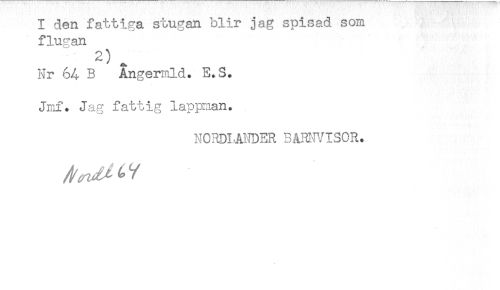 //// I den fattiga stugan blir jag spisad som //// flugan //// t—* //// 2) . //// Nr 64 B Angermld. E.S. //// Jmf. Jag fattig lappman. //// NORDLANDER BARNVISOR. ////