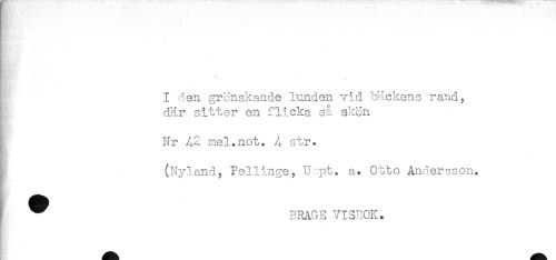 //// . //// I den grönskande lunden vid bäckens rand, //// } där sitter en flicka så skon //// . //// j Nr mel.not.. 4 str. //// . //// (Nyland, Pellinge, U:pt. a. Otto Andersson. //// ^ BRAGE VISBOK. ////