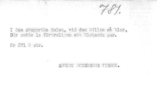 //// I den skuggrika dalen, vid den källan så klar, //// Där sutto la förtroligen ett älskande par. //// Nr 271 9 str. //// AUGUST 3CDSJS0NS VISBOK. ////