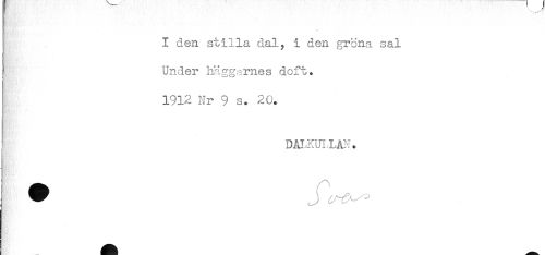 //// I den stilla dal, i den grena sal //// Under Iiäg^arnes doft. //// 1912 Nr 9 s. 20. //// DALKULLAN. //// ) //// ! //// < ////