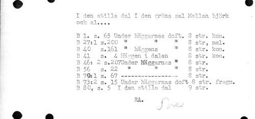 //// I den stilla dal I den gröna sal Mellan björk //// och al.... //// B 1. s. 65 Under häggarnes doft. 8 str. kon. //// B 27:1 s.200 ^ " " 8 str, mel. //// B 40 s.l6l ^ häggens ^ 8 str. kom. //// B 41 s. A Häggen i dalen 8 str. kom. //// B 46: 2 s.2G7Under Kaggarnas " 8 str. //// B 56 s. 22 " ^ '' 8 str. //// B 79:1 s. 67-------— — 8 str. //// B 73:2 s. 15 Under häggamas doft 8 str. fragm. //// B 80, s. 5 I den stilla dal 9 str. //// RÅ. ////