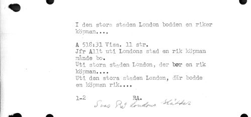 //// I den stora staden London bodden en riker //// köpman.... //// - //// A 518:31 Visa. 11 str. //// Jfr Allt uti Londons stad en rik köpman //// månde bo. //// Uti stora staden London, der bar en rik //// ; '*' //// köpman.... //// Uti den stora staden London, där bodde //// en köpman, rik.... //// 1-2 RÅ. , //// Jl^ Rf ^^ ////