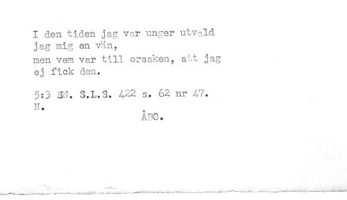 //// I den tiden jag var unger utvald //// jag mig en vän. //// men vem var till orsaken, att jag //// ej fick den. //// 5:3 SN. S.L.S. 422 s. 62 nr 47. //// N. //// ABC. //// ____-------—---^ ^---—' ' ----' " —- - ////