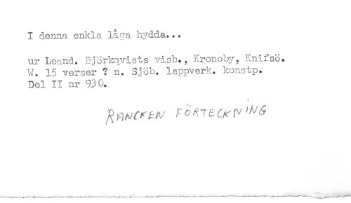 //// I denna enkla låga hydda... //// ur Leand. Björkqvists visb., Kronoby, Knifsö. //// 'W. 15 verser ? n. 3jöb. lappverk, konstp. //// Del II nr 930. //// ? ////