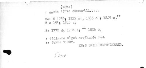 //// ^köna) //// ^ ^gnna ljuva soomartid..... //// Se: E 1759; 1832 n:, 1835 .c ; 1849 a/"* //// Z a 15^; 1833 a, //// Zz 1772 d; 1784 a; ++ 1826 o, //// + tidigare något avvikande red. //// ++ Sarncia visor. //// KB:S SKIHINGTRYGHSREG. ////