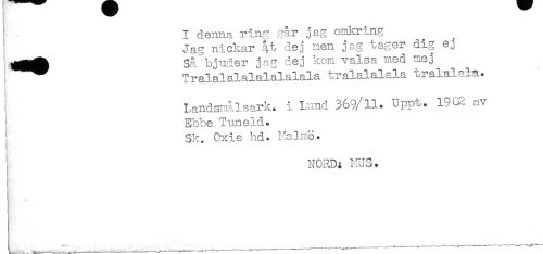 //// I denna ring .går jag omkring //// Ja" nickar 41 dej nen jag tager dig ej //// H))^ Så'bjuder jag dej kom valss med mej //// ^^^ Tralalalalalalalala tralalalala tralalala. //// < Landsmålsark. i Lund 367/11. Uppt. 1902 -v //// ! Ebbe Tuneld. //// Sk. Oxie hd. Halmö. //// t //// j NORD: HUS. //// * ////