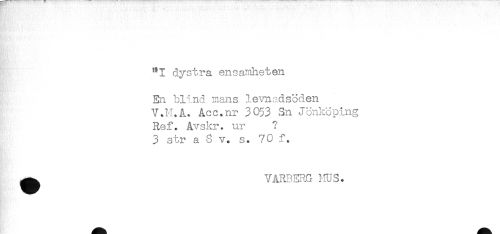 //// dystra ensaniheten //// En blind mans levnadsöden //// V.M.A. Aec.nr 3053 Sn Jönköping //// Ref. Avskr. ur ? //// 3 str a 8 v. s. 70 f. //// ^ VARBERG HUS. ////