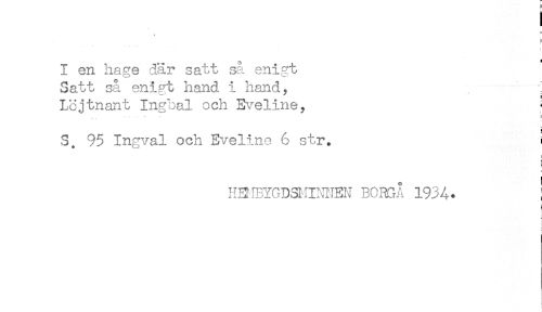 //// ) //// r //// I en hage där satt så enigt //// Satt så enigt hand i hand, //// Löjtnant Ingbal och Eveline, j //// s - * //// S. 95 Ingvai och Evelina 6 str. ! //// HBIBYGDSMINNEN BORGÅ 1934. ! //// ! //// . ////