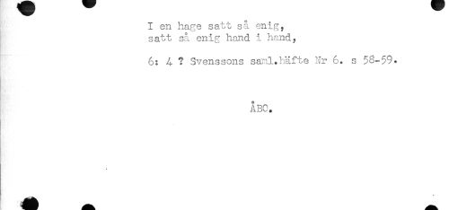 //// I en hage satt så enig, //// satt så enig hand i hand, //// 6: A ? Svenssons sanl.häfte Nr 6. s 58-59* //// ABC. //// I //// * //// ! j ^^ ////
