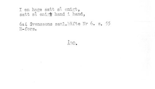 //// I en hage satt så enigt, //// satt så enig# hand i hand, //// 6:4 Svenssons saml.häfte Nr 6. s. 55 //// H-fors. //// ÅBO. ////