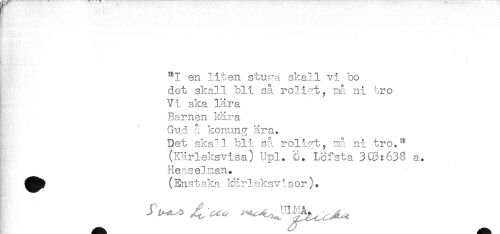 //// "I en liten stur-a skall vi bo //// det skall bli så roligt, må ni tro //// Vi ska lära //// Barnen kära. //// Gud å konung ära. //// o //// Det skall bli sa roligt, må., ni tro. //// (Kärleksvisa) Upl. LHfsta 303:638 a. //// Hesselman. //// ^^ (Enstaka kärleksvisor). ////
