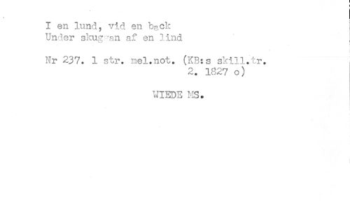//// I en lund, vid en bgck //// Under skug -an af en lind ; //// Nr 237. 1 str. mel.not. (KB:s skill.tr. //// 2. 1827 o) //// UIEDE MS. ////