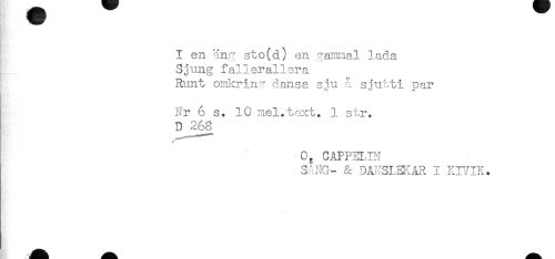 //// I en äng sto(d) en gaimal lada //// Sjung fallerallora //// Runt omkring dansa sju a sjutti par //// Nr 6 s. 10 mel.toxt. 1 str. //// D 268 //// Os CAPPELIN //// SANG- & DA .SI EKAR I KF7IK. ////