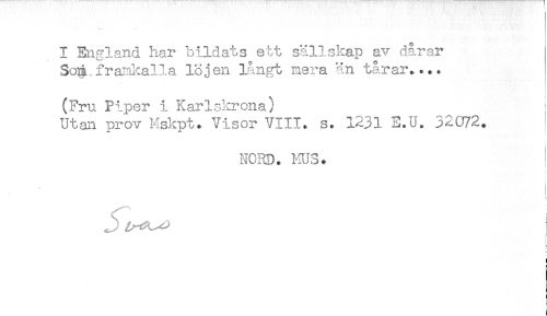 //// I England har bildats ett sällskap av dårar //// So$ frankalla löjen långt mera än tårar.... //// (Fru Piper i Karlskrona) //// Utan prov Mskpt. Visor VIII. s. 1231 E.U. 32072. //// NORD. MUS. ' //// / ^ . ^ //// t //// < ////