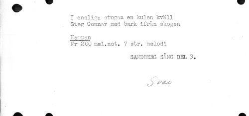 //// I ensliga stugan en kulen kväll //// ; _ Steg Gunnar med bark ifrån skogen //// Harpan //// Nr 200 mel.not. 7 str. melodi //// SANDBERG SANG DEL 3. //// * ////