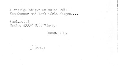 //// I ensliga stugan en kulen kväll ^ ^ //// Kom Gunnar ned bark ifrån skogen,... ' L //// (mel.not.) //// Msktp. 43332 E.U. Visor. [ //// t //// - //// ä //// NORD. MUS. ' //// t- //// ! //// * E //// J ^^ ////