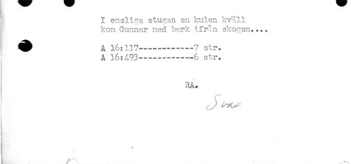 //// i I ensliga stugan en kulen kväll //// kon Gunnar med bark ifrån skogen.... //// ^ Ä 16:117......——.-7 str. //// Ä 16:493------.——.-6 str. //// RA* //// ; r ////