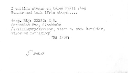 //// I ensliga stugan en kulen kväll steg //// Gunnar med bark ifrån skogen.... //// ..... ... .. , //// t //// i //// insp*, Rtj: 22280: 2-3.. //// Strgmblad Eva^ Stockholm //// /skilllngtrycksvisor^ visor m. sod. karaktär3 //// visor om fat'ii ögon/ //// ?RÅ INSP*. ////