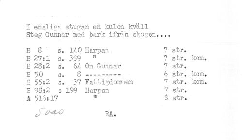 //// I ensliga stugan en Imlen kväll //// Steg Gunnar med bark ifrån skogen.... //// - ! //// B 8 s. 140 Harpan 7 str. //// B 27:1 s. 339 * 7 str. kom. //// B 28:2 s. 64 Om Gunnar 7 str. //// B '50 s. 8---6 str. kom. //// B 55:2 s. 37 Fattigdommen 7 str. kom. //// B 98:2 s 199 Harpan 7 str. //// A 516:17 " 8 str. //// RA. ////