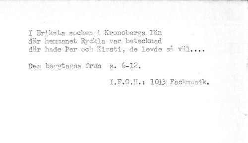 //// I Eriksta socken i Kronobergs län //// där hemmanet Hyckla var betecknad //// där hade Per och Kirsti, de levde sa väl.... //// Den bergtagna frun s. 6-12. //// I.F.G.H.: 1CL3 Fadmusik. ////
