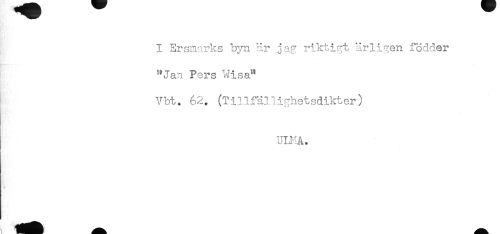 //// I Ersmarks byn är jag riktigt ärligen fodder //// "Jan Pers Wisa^ //// Vbt. 62. (Tillfällighetsdikter) //// ULMÅ. ////