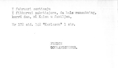 //// I februari sextiosju //// I fibbarvai sakstisjore, da halsrransakning, //// kerrä dan, nå Kalsn u familjen, //// Nr 172 sid. 1.42 ''Karlsson" 1 str. //// FREDIN //// mTLÅNDSrONER. ////