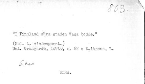 //// (j L/ ^ - //// - Finnland nära staden Vasa bodde.^ //// (Mel. t. visfnagment.) //// Dal. Grangärde, 14900^ s. 63 a Eriksson, L. //// imiå. ////