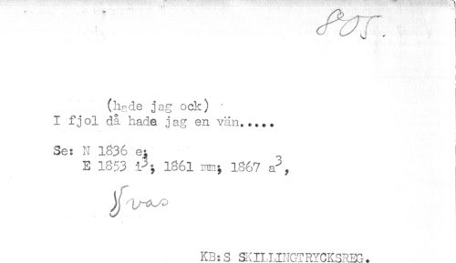 //// t //// (hrde jag ock) ' //// I fjol då hade jag en vän..... //// Se: N 1836 e; //// E 1853 i-^; 1861 nin; 1867 a"", //// KB:S SKILLINGTRYCKSREG. ////
